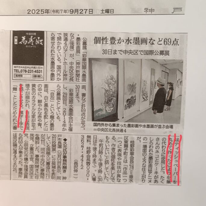 今、「『公募展』第29回展 彩華国際水墨画・墨采展 2025」が神戸元町で開催中であります。9月25日(木)〜9月30日(火)の間。小弟、縁あり 出品致しました。当然「紙こより画」としてであります。総出品数は、69作品、うち国外からの出品は18点でありましす。『紙こより画』1点 と『筆による「墨画」』68点であります。手法の違いを「肌」で感じて参りました。しかし、決して「くじけては」おりません。一つの方向性を模索中でありますので紙面を埋め尽くすように描かれた「水墨画」「墨彩画」に対抗する手法は既に考えております。構想としては出来上がっているのでありますが、もう暫くお待ち下さい。