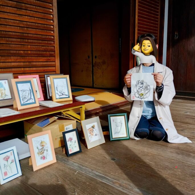 小弟は、作画中でしたが「若い女性が、縁側越しに作品を見ている」事には気づいておりました。しばらく様子を見ておりますと、女性が「かえる、かえる・・・」と言っているのが聞こえたので、気になって声をかけると、方丈の入り口の看板に、カエルの絵に『座禅して人が佛になるならハ』と描いた看板があったのですが、その「カエルの絵」を探している事が分かり、絵を描くのをやめて、対応致しました。