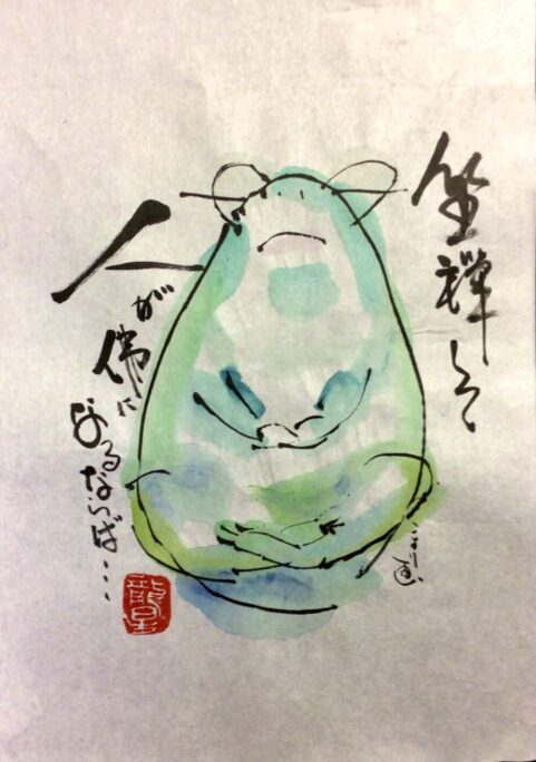 私は,この「賛」に、相当前に出逢っているのですが、私は、チョット遊びのつもりで、この後に「人が仏になるならハ、すでに己等は大阿闍梨」と付け足して絵をよく描いたものです。座禅という形だけに拘って「座禅」を続けても「悟り」には至らないと言う思いを描いたことがありました。