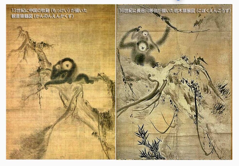 牧谿のモチーフの中でも猿は非常に人気があり、雪村や式部輝忠といった関東水墨画の絵師たちも多く作品を持っていたようです。最も熱心に牧谿を学んだのは「長谷川等伯」です。等伯は、牧谿の技法等を真似て描いた作品が下記写真ですが、よく似た筆遣いで画風もよく似た作品を描いております。