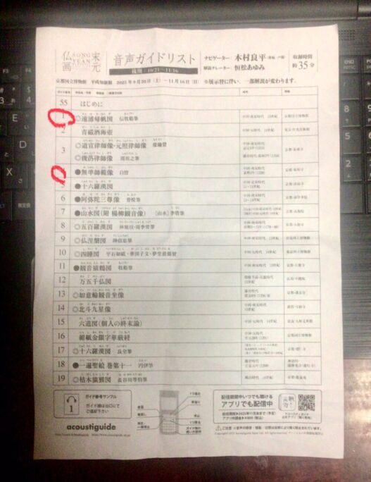 音声ガイドをお借りして、主だった展示物を見て参りました。私は、入館するまでは、中国から作品が送られてきて会場に展示されたものと思っておりましたが、そうではなく、宋元時代の僧侶が、中国から日本に来る時に持って来た作品、或いは我が国の当時の僧侶・画家などが描いた作品が展示されておりました。展示作品の所蔵先は、全て国内の仏閣・美術館であります。(写真添付「音声ガイドリスト」を参照して下さい。)
