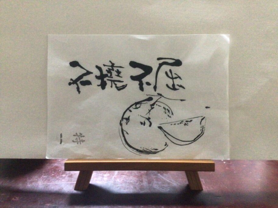 次に、「紙こより」で「不撓不屈」を書いてもらった。「紙こより」の先で書くので「線」が細い。貧弱な字であった。書くコツ、墨をたっぷり「こより」に吸い取らせ、墨を貯めるところ、流すところなと、線を引く方向など、細かく指導したが、なかなか出来ない。「書こうとするから書けない」、「こよりに任せ、こよりに書いてもらうつもりで」で書くことを指導しても、書こうとするので「面白くない線」が出てくる。紙こより画の文字にしても、絵にしても、書き手が意図しない線が出てくる所に面白さ、味わいが出てくるので、「書こうとしないこと」が基本と指導。