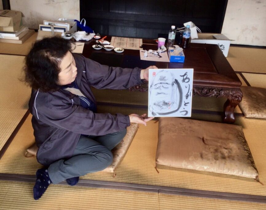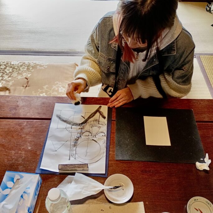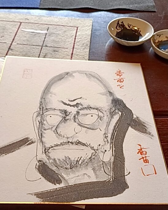 この彼女は、絵が好きで、よく描いているようです。色紙にバランス良く絵を入れるコツを説明するとそれを理解して書き、薄墨の入れ方を説明しても、迷わずティッシュに水を着けて描いてました。最後に「達磨の目」の入れ方は、具体的に説明しました。